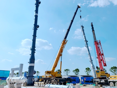 據悉,此次吊裝吸收塔和再生塔是本項目脫酸單元的核心設備,為確保本次吊裝的平穩(wěn)有序推進,項目組積極與咸陽禮泉縣道路運輸管理部門、供貨商、施工方等各方對接,確定了發(fā)貨時間、運輸路徑,并嚴格篩查相關人員行程軌跡,確保吸收塔和再生塔的順利進場。隨后及時進行設備驗收,同時督促施工方制定并優(yōu)化吊裝方案,確保吊裝機具到位,將吸收塔和再生塔成功吊裝到位。