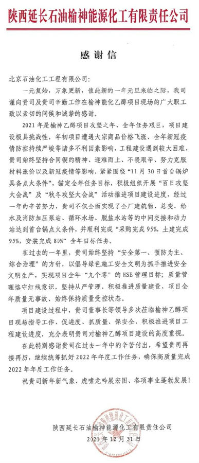元旦前夕,北京石油化工工程有限公司先后收到延長石油集團(tuán)和旗下的榆神能化公司發(fā)來的感謝信,信中對北油工程EPC總承包的50萬噸/年煤基乙醇項(xiàng)目建設(shè)期間付出的辛勤勞動(dòng)表示感謝,并向項(xiàng)目現(xiàn)場廣大職工致以節(jié)日的問候。