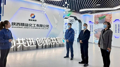 許緘濤一行首先來到陜西精益化工有限公司展覽室進行參觀,通過講解員的講解,就企業的發展歷程、一期建設50萬噸/年煤焦油深加工多聯產綜合利用項目及2×40.5MVA硅鐵礦熱爐綜合利用項目等進行了了解。