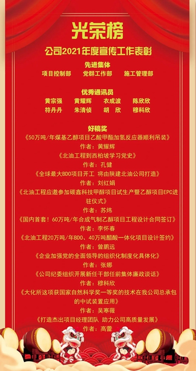 為表彰先進,樹立典型,激發新聞宣傳隊伍的工作熱情,進一步做好公司信息宣傳工作,近日,北京石油化工工程有限公司對2021年度宣傳工作先進集體和優秀個人進行了表彰。