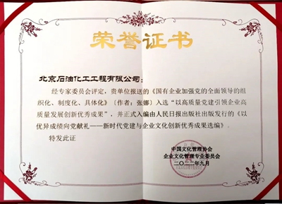 北京石油化工工程有限公司榮獲“黨建強企優秀案例一等獎”。另外,公司黨委申報的2021年度和2022年度兩篇黨建和企業文化研究成果獲獎:《黨建引領文化促進企業高質量發展的管理體系研究》榮獲“企業黨建實踐創新成果一等獎”;《國有企業加強黨的全面領導的組織化、制度化、具體化》入選“以高質量黨建引領企業高質量發展創新優秀成果”,并正式入編由人民日報出版社出版發行的《以優異成績向黨獻禮——新時代黨建與企業文化創新優秀成果選編》。