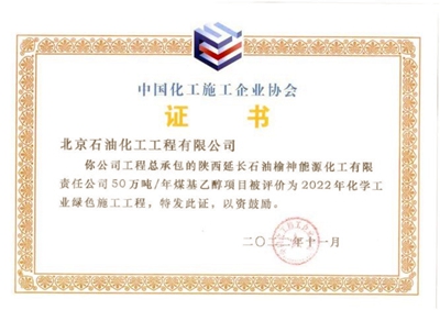 近日,由北京石油化工工程有限公司(簡稱:北油工程)總承包的榆神能化50萬噸/年煤基乙醇項目獲得中國化工施工企業協會頒發的“2022年度化學工業優質精品工程”、“2022年度化學工業安全文明工地”及“2022年度化學工業綠色施工工程”等三項殊榮。
