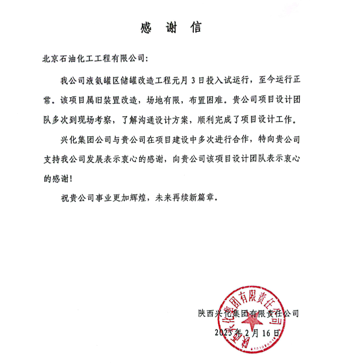 近日,北京石油化工工程有限公司收到陜西興化集團發來的感謝信,對我公司在負責液氨罐區儲罐改造工程設計工作期間優化設計方案、主動協調配合,高質量完成建設任務給予了充分肯定。
