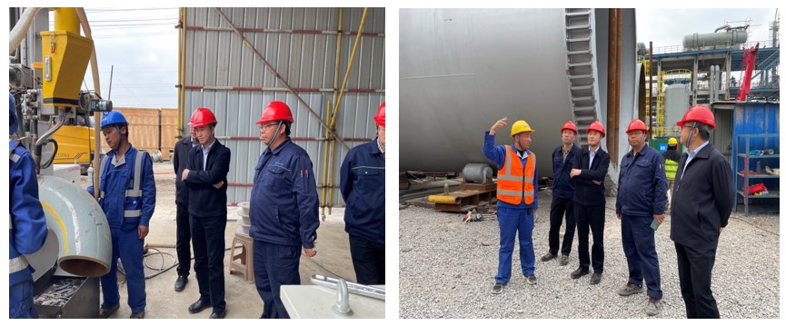 許緘濤還分別前往設備預制場、管道自動焊預制場,對最后一臺反應器的制造進程、組裝塔器“穿衣戴帽”進程、管道預制自動焊等工作進行調研。