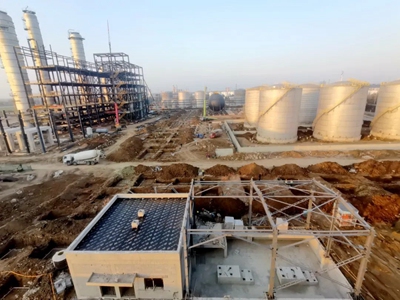 目前,項目整體建設(shè)完成64%,裝置鋼結(jié)構(gòu)安裝完成85%,靜設(shè)備累計安裝81臺,全廠工藝熱力管網(wǎng)基礎(chǔ)及鋼結(jié)構(gòu)施工完成68%,除鹽水站、灌裝立體庫基礎(chǔ)施工中。