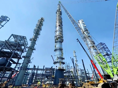 乙醇塔是本項目核心設備,直徑4.8米,高度116米,總重380噸,分4段進場組對。尤其最后吊裝的上段設備長達25米、重達126噸,吊裝難度大,精度要求高。面對場地條件受限、惡劣天氣等不利因素,項目組與各參建方精心策劃、周密部署,通過科學管理,在38天窗口期內高效完成包括超高、超重塔器及反應器的安裝,為項目的全面推進創(chuàng)造了有利條件。