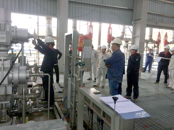 為順利完成兩臺壓縮機負荷試車,項目組抽調技術骨干,配合業主對界區介質(中壓蒸汽、氮氣、儀表風、循環水等)運行參數、提前啟動汽輪機暖機、防喘振系統調試及模擬測試、一二三級系統管支架、儀表運行及參數等環節逐一進行了核查。在完成機組、系統、安全等相應手續簽字后,下午16時35分,丙烯制冷壓縮機組開始負荷試車,經過3個小時的平穩運行后,中控顯示系統溫度、壓力、機組振動值均在正常運行范圍內。隨后,試車團隊又開始乙烯制冷壓縮機機組的負荷試車。晚上22時10分,該設備運行平穩,各項參數運行數據正常,試車一次成功。至此,ACO裝置同日完成了兩臺壓縮機試車任務。